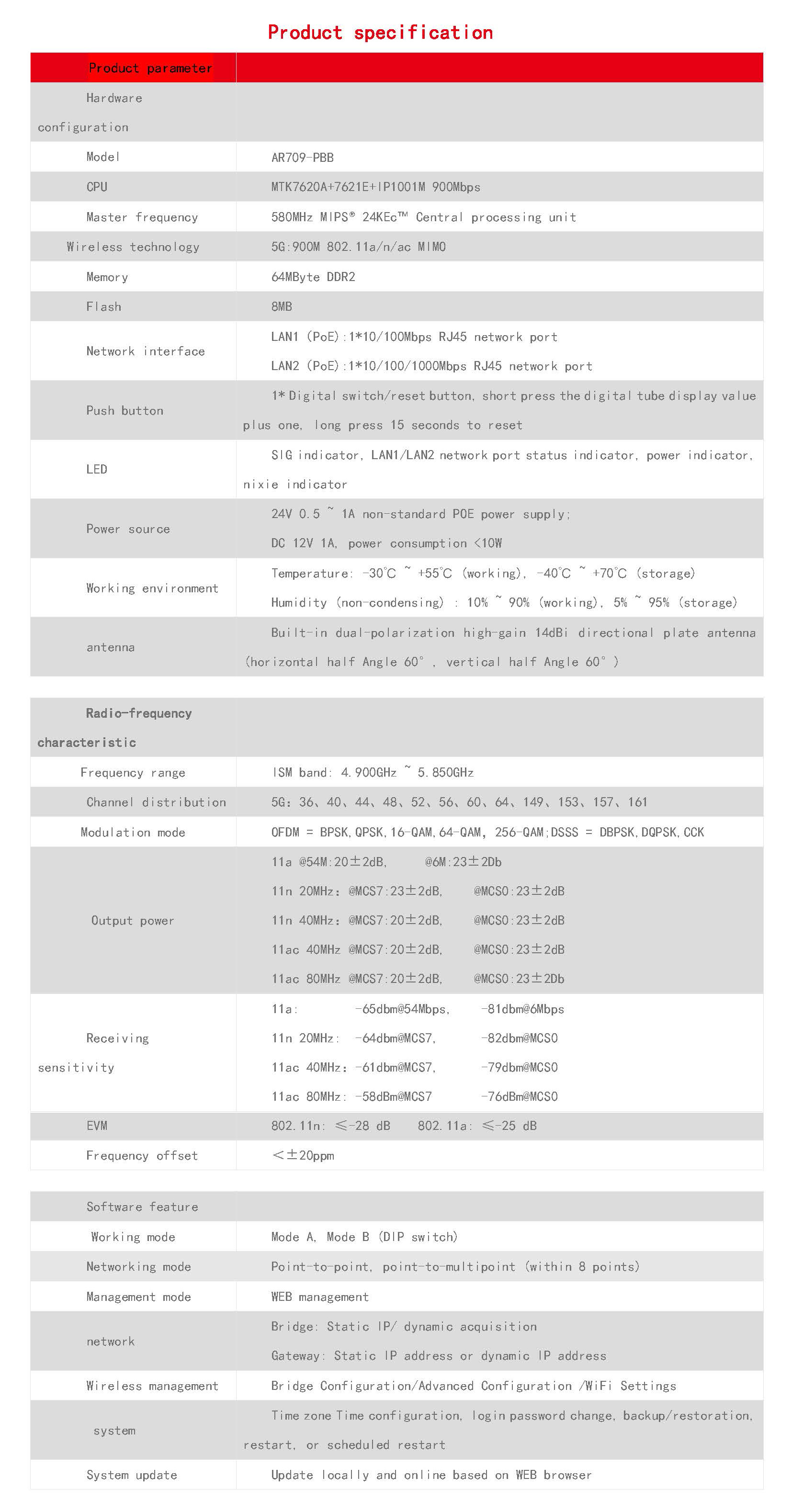 AR709-PBB is a high-performance enterprise outdoor bridge product that supports 802.11ac technology in the 5G band. It can transmit 5KM distance, and the unique digital tube pairing technology can easily complete the pairing of point-to-point and point-to-multipoint (within 8 points) equipment without computer configuration. Gigabit + 100 Gigabit network interface, 5G 802.11ac MIMO technology wireless processing speed of up to 900Mbps. The power supply mode is flexible, supporting 24V POE power supply and 12V 1A DC local power supply. The power supply distance of the network cable can reach 50 to 70 meters (depending on the material of the network cable). Outdoor IP65 wind, rain, dust, sun protection grade shell design, easily adapt to various outdoor harsh environment. Built-in 14dBi double active plate antenna, easy to install. With high performance, high gain, high receiving sensitivity, high bandwidth and other characteristics, greatly enhance the wireless transmission performance and stability, widely used in short and medium distance video transmission and data transmission.